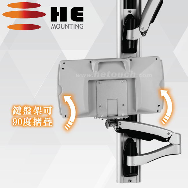 非採用氣壓或油壓棒控制升降,沒有洩氣及漏油等問題,所以裝置新一代扭力桿的旋臂,可耐重2公斤以上10公斤以下的顯示器與2.5公斤以內的鍵盤滑鼠等週邊設備,不會日久鬆弛、一蹶不振,故HE能提供長達5年的保固期。